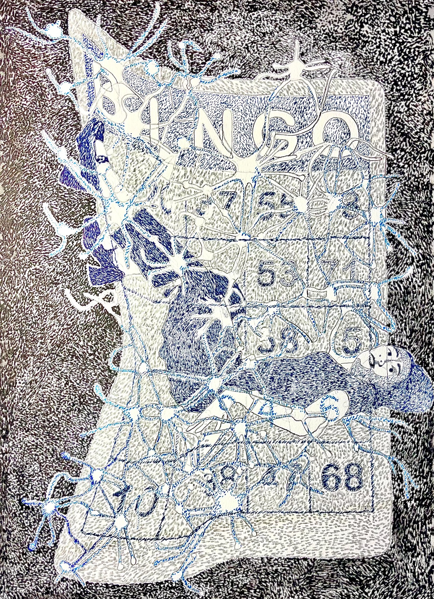 Inspiration: The husband of one of the residents we took care of was explaining how BINGO had become too complicated and confusing for his wife to play. Of course it made me really sad and to me this drawing represents themes of memory, aging, and identity. BINGO is a game that has a very positive connotation, so this drawing contradicts that by having a more somber mood with the limited black and blue palette.